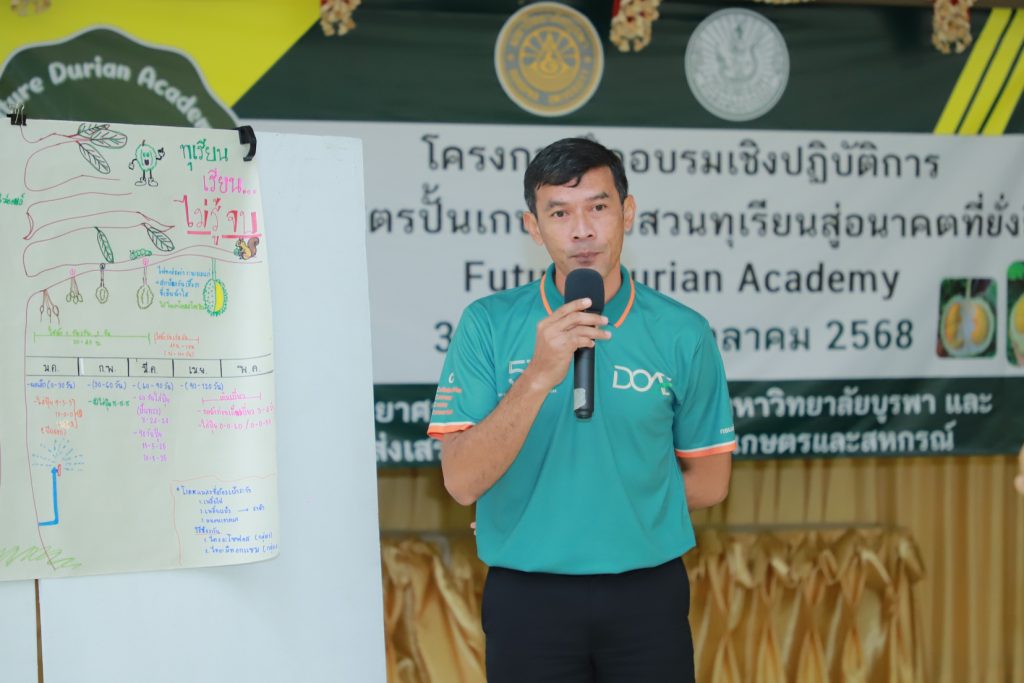 กรมส่งเสริมการเกษตรร่วมกับมหาวิทยาลัยบูรพา วิทยาเขตจันทบุรี ฝึกอบรมเชิงปฏิบัติการ หลักสูตร ปั้นเกษตรกรสวนทุเรียนสู่อนาคตที่ยั่งยืน : Future Durian Academy ณ มหาวิทยาลัยบูรพา วิทยาเขตจันทบุรี จังหวัดจันทบุรี หลักสูตรครบวงจรที่ผสานองค์ความรู้ด้านวิชาการและการลงมือปฏิบัติจริง เพื่อยกระดับเกษตรกรสวนทุเรียนสู่การผลิตที่มีมาตรฐานและสามารถต่อยอดธุรกิจอย่างยั่งยืน