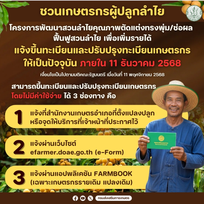 สื่อประชาสัมพันธ์ โครงการพัฒนาสวนลำไยคุณภาพตัดแต่งทรงพุ่ม/ช่อผล ฟื้นฟูสวนลำไย เพื่อเพิ่มรายได้ 19/11/202526/12/2025 Khantarot Download ขยายเวลารับสมัครเข้าร่วมโครงการฯ SPOT RADIO ดาวน์โหลด [MP3] ข้อมูลโครงการฯ ข้อมูลประกอบ-โครงการพัฒนาสวนลำไยคุณภาพดาวน์โหลด [PDF] INFOGRAPHICS เชิญชวนเกษตรกรผู้ปลูกลำไยขึ้นทะเบียนเกษตรกร เชิญชวนเกษตรกรผู้ปลูกลำไยเข้าร่วมโครงการฯ SPOT RADIO ดาวน์โหลด [MP3] ดาวน์โหลด [MP3] VIDEO โปรโมทโครงการพัฒนาสวนลำไยคุณภาพฯดาวน์โหลด [MP4] รายละเอียดสัญญา โครงการพัฒนาสวนลำไยคุณภาพฯดาวน์โหลด [MP4] ลำไย โครงการพัฒนาสวนลำไยคุณภาพฯ