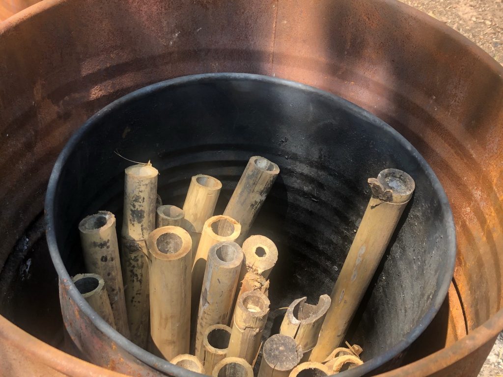 4) นำวัสดุบรรจุใส่ด้านในถังที่เป็นเตาเผาถ่านชีวภาพ