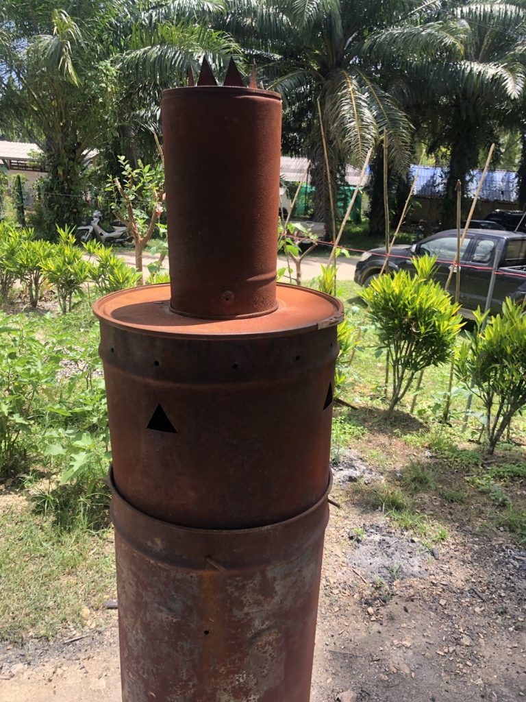 7) ปิดฝาถังเตาเผา ขณะทำการเผาจะต้องสังเกตควันไฟที่ออกจากปล่อง ถ้าไม่มีควันลอยขึ้นหรือมีน้อยต้องแก้ไขโดยเร็ว เพื่อไม่ให้ไฟดับ โดยสังเกตที่ช่องอากาศด้านล่าง ถ้ามีเศษไม้ปิดช่องอากาศ ต้องทำให้อากาศเข้าได้
