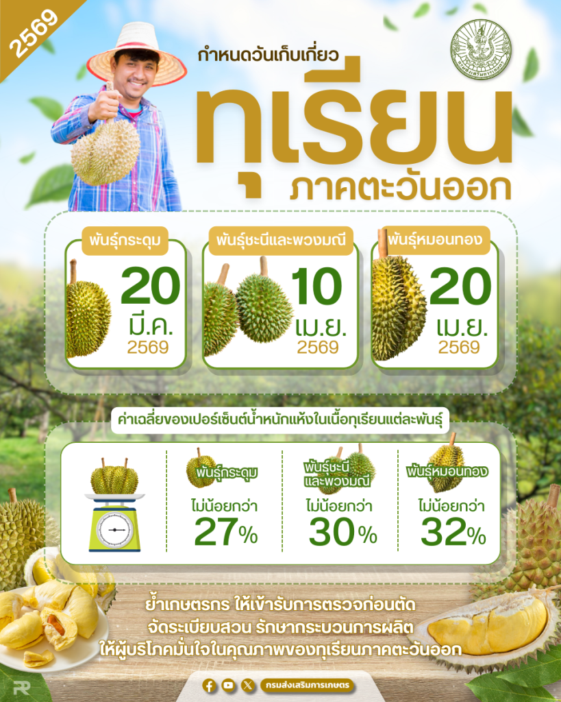 นางอัญชลี สุวจิตตานนท์ อธิบดีกรมส่งเสริมการเกษตร กล่าวว่า กรมส่งเสริมการเกษตรร่วมกับหน่วยงานภาคีทั้งภาครัฐ เอกชนและเกษตรกร วางแนวทางการบริหารจัดการทุเรียนเพื่อการส่งออกภาคตะวันออก กำหนดวันเก็บเกี่ยวทุเรียนภาคตะวันออก ปี 2569 เพื่อใช้เป็นกรอบระยะเวลาในการดำเนินงาน เพื่อให้ผลผลิตทุเรียนที่ออกสู่ตลาดมีคุณภาพคือ พันธุ์กระดุม วันที่ 20 มีนาคม 2569 พันธุ์ชะนีและพวงมณี วันที่ 10 เมษายน 2569 พันธุ์หมอนทองและก้านยาว วันที่ 20 เมษายน 2569 กำหนดการพิจารณาความอ่อน – แก่ของทุเรียน โดยใช้เกณฑ์กำหนดน้ำหนักเนื้อแห้งของทุเรียน ตามประกาศกระทรวงเกษตรและสหกรณ์ เรื่อง กำหนดมาตรฐานสินค้าเกษตร : ทุเรียน มกษ. 3 – 2567 ลงวันที่ 31 พฤษภาคม พ.ศ. 2567 พันธุ์กระดุมทอง มีน้ำหนักเนื้อแห้งไม่น้อยกว่า 27% โดยมวล พันธุ์ชะนีและพวงมณี มีน้ำหนักเนื้อแห้ง ไม่น้อยกว่า 30% โดยมวล พันธุ์หมอนทองและก้านยาว มีน้ำหนักเนื้อแห้งไม่น้อยกว่า 32% โดยมวล ซึ่งถ้าผลการวิเคราะห์น้ำหนักเนื้อแห้งของทุเรียนน้อยกว่านี้ ถือว่าเป็นทุเรียนด้อยคุณภาพ (ทุเรียนอ่อน)