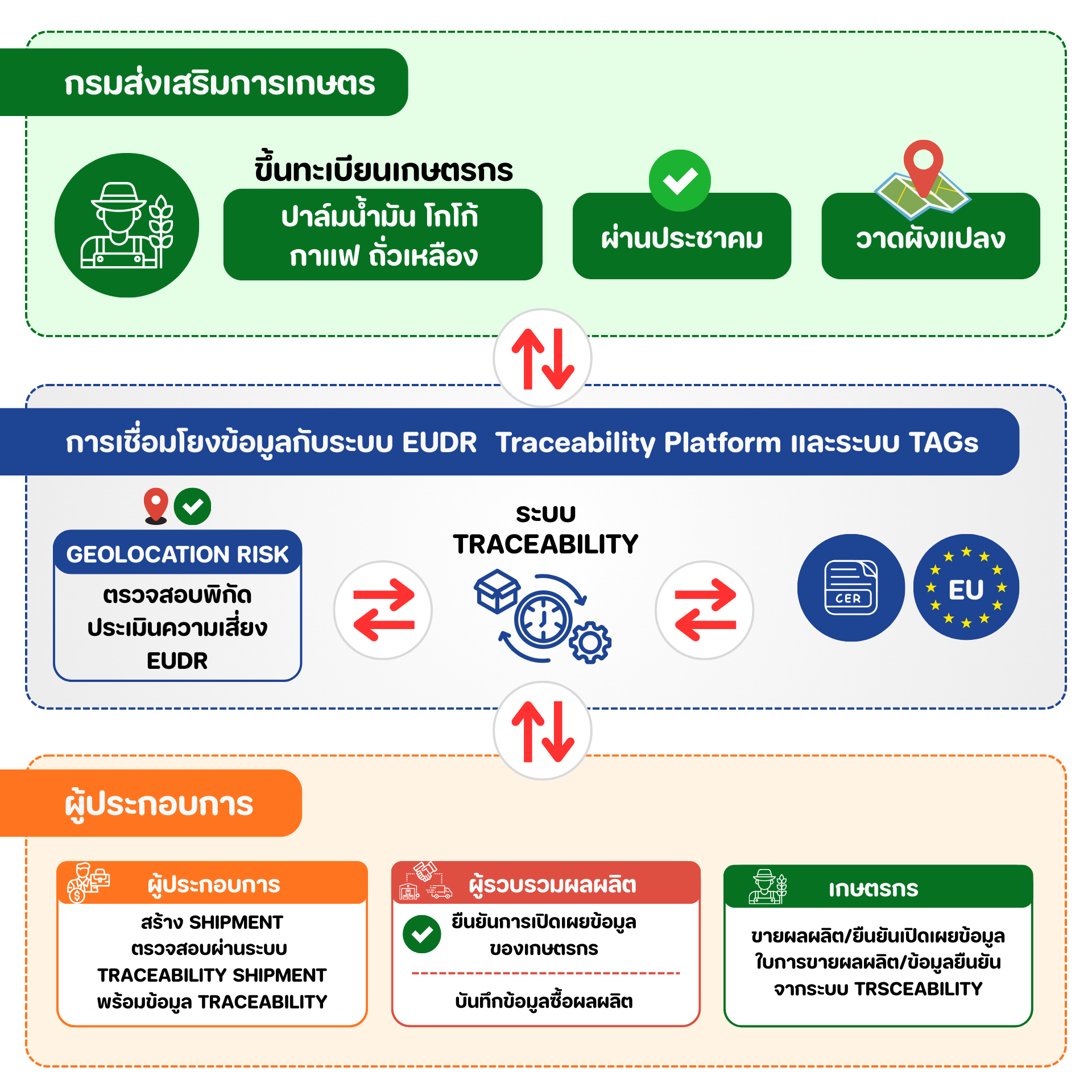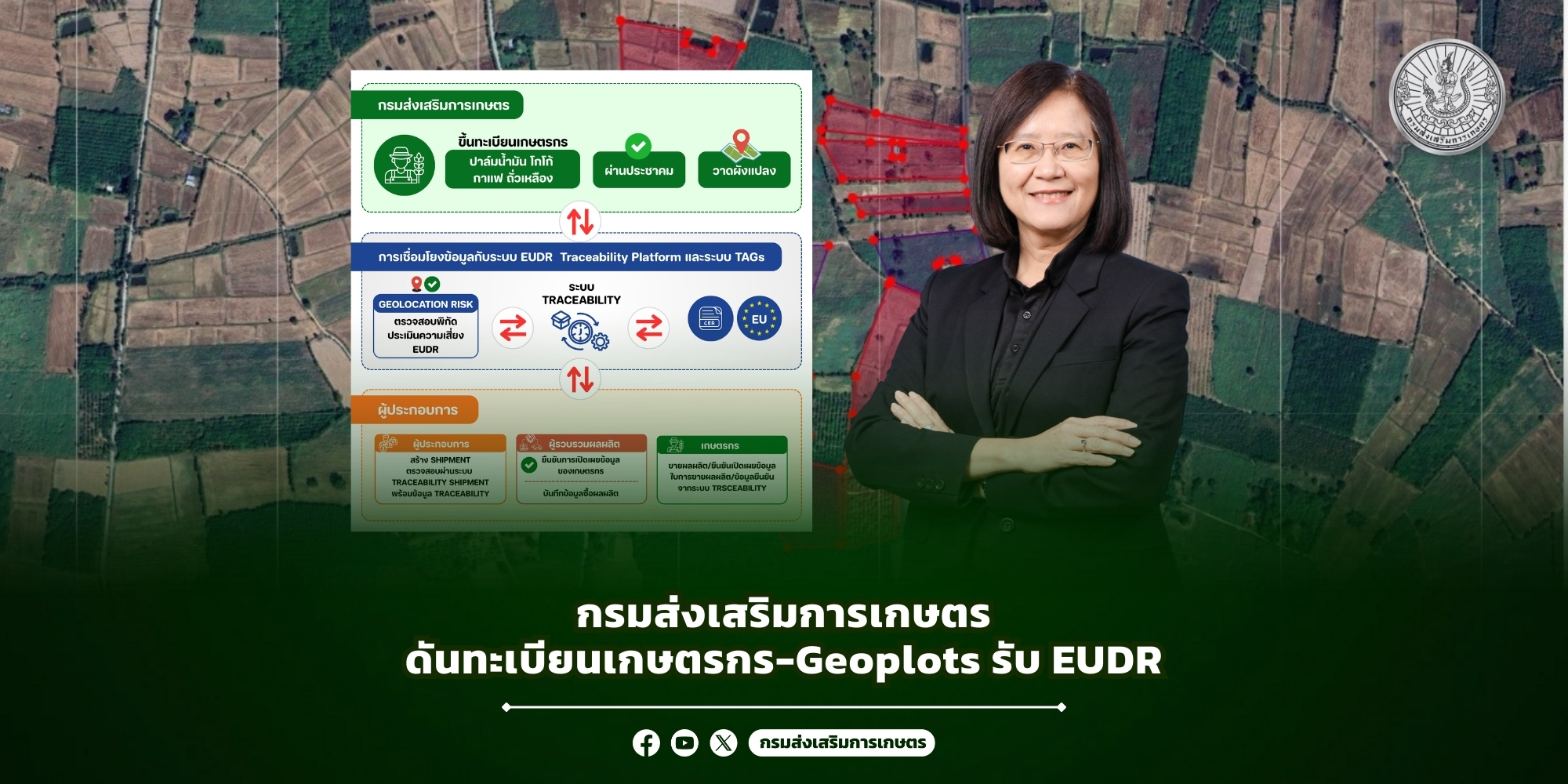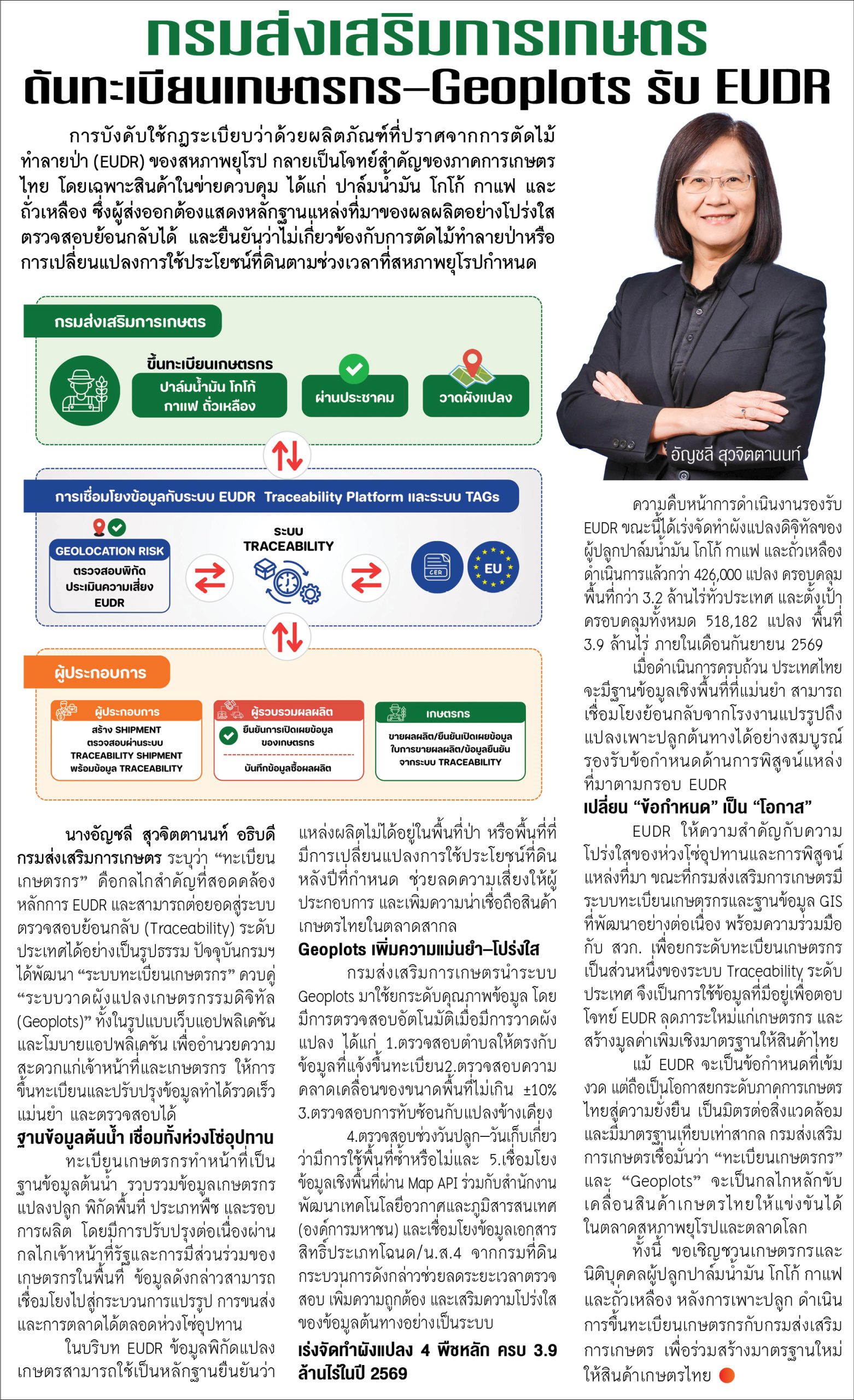 นางอัญชลี สุวจิตตานนท์ อธิบดีกรมส่งเสริมการเกษตร ระบุว่า “ทะเบียนเกษตรกร” คือกลไกสำคัญที่สอดคล้องหลักการ EUDR และสามารถต่อยอดสู่ระบบตรวจสอบย้อนกลับ (Traceability) ระดับประเทศได้อย่างเป็นรูปธรรม ปัจจุบันกรมฯ ได้พัฒนา “ระบบทะเบียนเกษตรกร” ควบคู่ “ระบบวาดผังแปลงเกษตรกรรมดิจิทัล (Geoplots)” ทั้งในรูปแบบเว็บแอปพลิเคชันและโมบายแอปพลิเคชัน เพื่ออำนวยความสะดวกแก่เจ้าหน้าที่และเกษตรกร ให้การขึ้นทะเบียนและปรับปรุงข้อมูลทำได้รวดเร็ว แม่นยำ และตรวจสอบได้