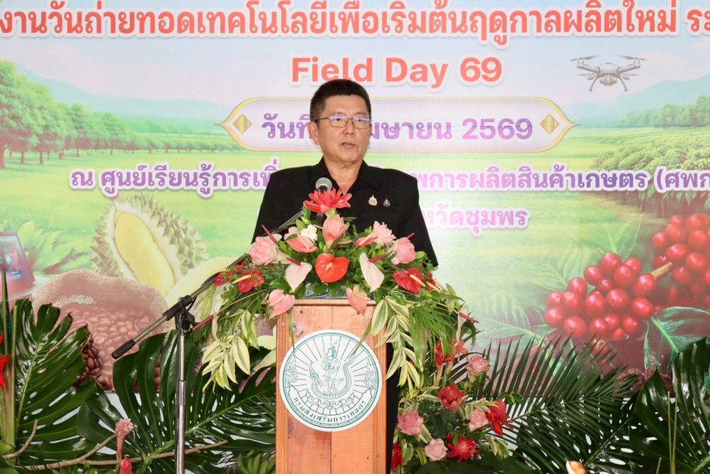นายเธียรชัย ชูกิตติวิบูลย์ ผู้ว่าราชการจังหวัดชุมพร กล่าวเพิ่มเติมว่า การขับเคลื่อนภาคการเกษตรในปัจจุบันจำเป็นต้องอาศัยองค์ความรู้ เทคโนโลยี และนวัตกรรมที่ทันสมัย ควบคู่กับการใช้ข้อมูลที่แม่นยำในการวางแผนการผลิต เพื่อให้สามารถรับมือกับความผันผวนของสภาพภูมิอากาศ สถานการณ์ตลาด และศัตรูพืชได้อย่างมีประสิทธิภาพ โดยเฉพาะในพื้นที่ภาคใต้ตอนบนซึ่งเป็นแหล่งผลิตไม้ผลเศรษฐกิจสำคัญ อาทิ ทุเรียน มังคุด และกาแฟโรบัสต้า ที่สร้างรายได้หลักให้กับเกษตรกร